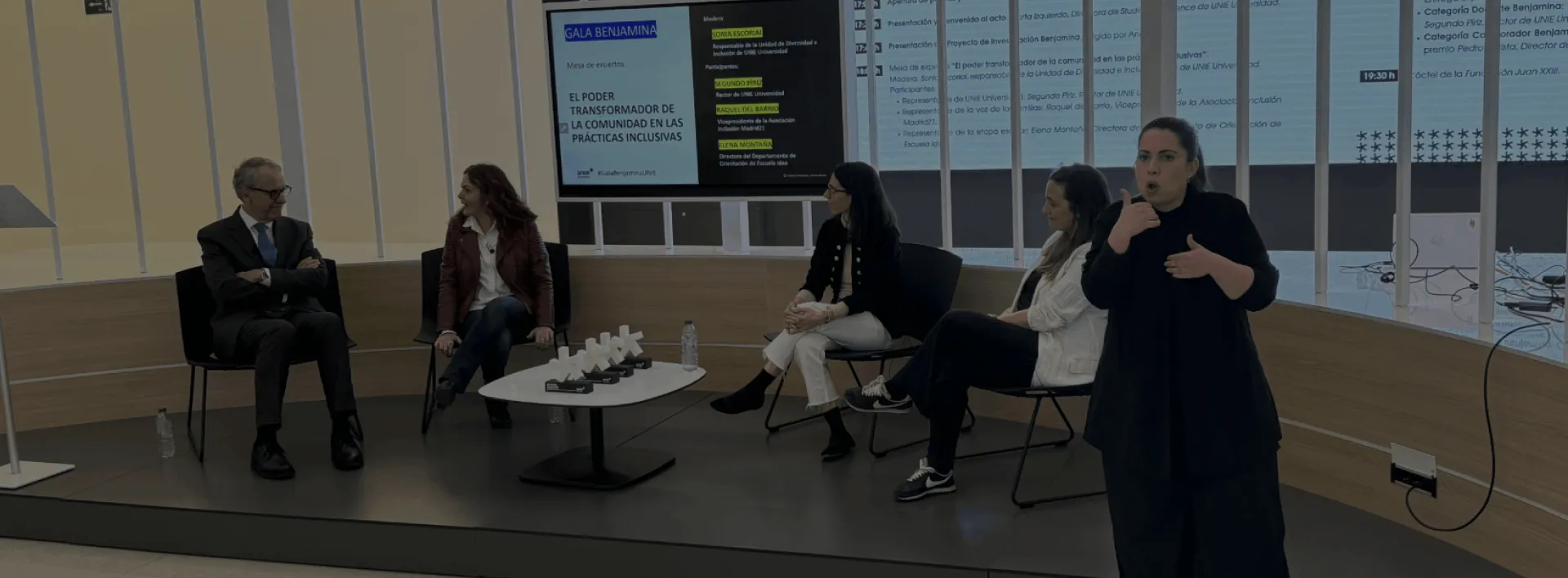 El vídeo sobre Benjamina sirvió de preludio a la mesa redonda "El poder transformador de la Comunidad en las prácticas inclusivas". Moderada por Sonia Escorial, la mesa contó con la participación de Segundo Píriz, Rector de UNIE Universidad; Raquel del Barrio, Vicepresidenta de la Asociación Inclusión Madrid21; y Elena Montaña, Directora del Departamento de Orientación de Escuela Ideo.
